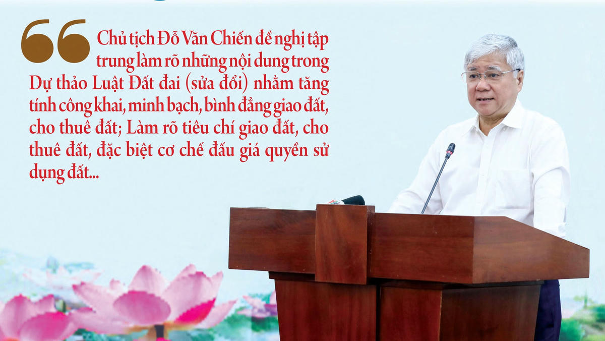 Để góp phần hoàn thiện Dự án luật trước khi trình Quốc hội cho ý kiến tại kỳ họp lần thứ 4 Quốc hội khóa XV, Chủ tịch Đỗ Văn Chiến đề nghị, Dự thảo Luật Đất đai (sửa đổi) cần thể chế hóa những điểm mới theo Nghị quyết số 18-NQ/TW, các chủ trương của Đảng về đất đai; sự tương thích của Dự thảo Luật Đất đai (sửa đổi) với Hiến pháp năm 2013 và các luật khác có liên quan.