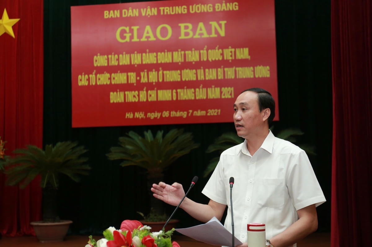 Chiều 6/7, tại Hà Nội, Ban Dân vận Trung ương tổ chức Hội nghị giao ban công tác dân vân của Đảng đoàn MTTQ Việt Nam, các tổ chức chính trị - xã hội ở Trung ương và Ban Bí thư Trung ương Đoàn TNCS Hồ Chí Minh 6 tháng đầu năm 2021.