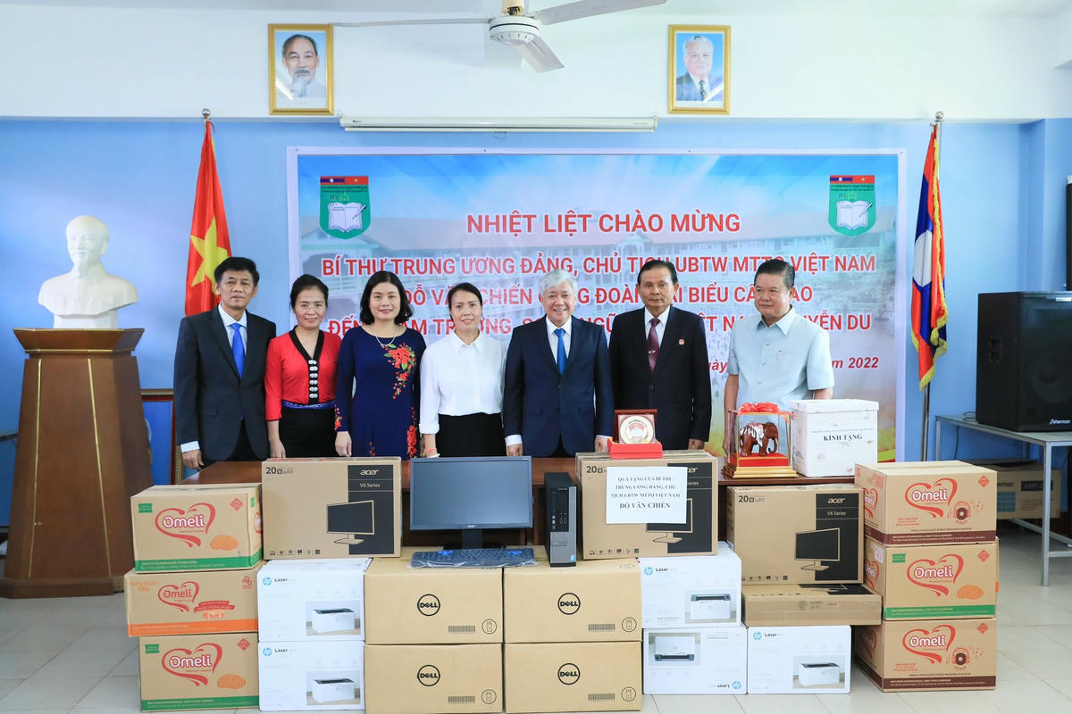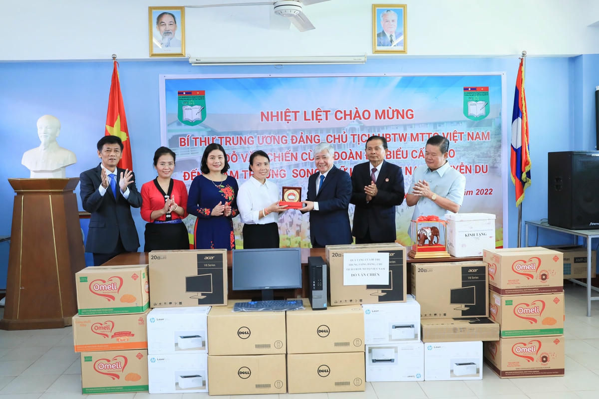 Nhân dịp này, Bí thư Trung ương Đảng, Chủ tịch Đỗ Văn Chiến đã trao món quà gồm 5 bộ máy vi tính và máy in hỗ trợ Trường song ngữ Lào - Việt Nguyễn Du với mong muốn thầy và trò nhà trường sẽ tiếp tục nỗ lực vượt khó, đạt nhiều thành tích hơn nữa trong sự nghiệp giáo dục đào tạo; không ngừng đẩy mạnh tuyên truyền, giáo dục về truyền thống quan hệ đặc biệt Việt Nam - Lào trong các tầng lớp nhân dân, nhất là thế hệ trẻ hai nước qua đó góp phần đưa quan hệ hữu nghị vĩ đại, đoàn kết đặc biệt và hợp tác toàn diện Việt Nam - Lào ngày càng phát triển tốt đẹp.