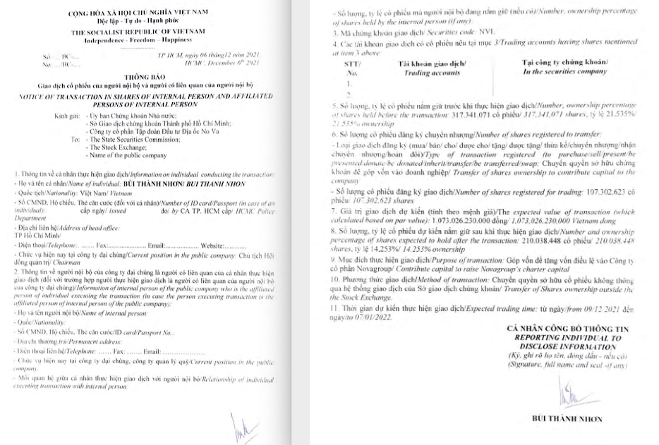 Mục đích được đưa ra là nhằm góp vốn để tăng vốn điều lệ vào CTCP Novagroup. Thời gian dự kiến thực hiện giao dịch từ 9/12 đến ngày 7/1/2022. Thương vụ chuyển quyền sở hữu này sẽ không thực hiện trên hệ thống giao dịch của HoSE.