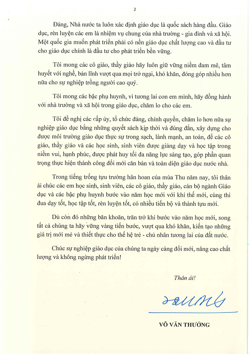 Thư của Chủ tịch nước Võ Văn Thưởng gửi ngành Giáo dục nhân dịp khai giảng năm học 2023 - 2024.