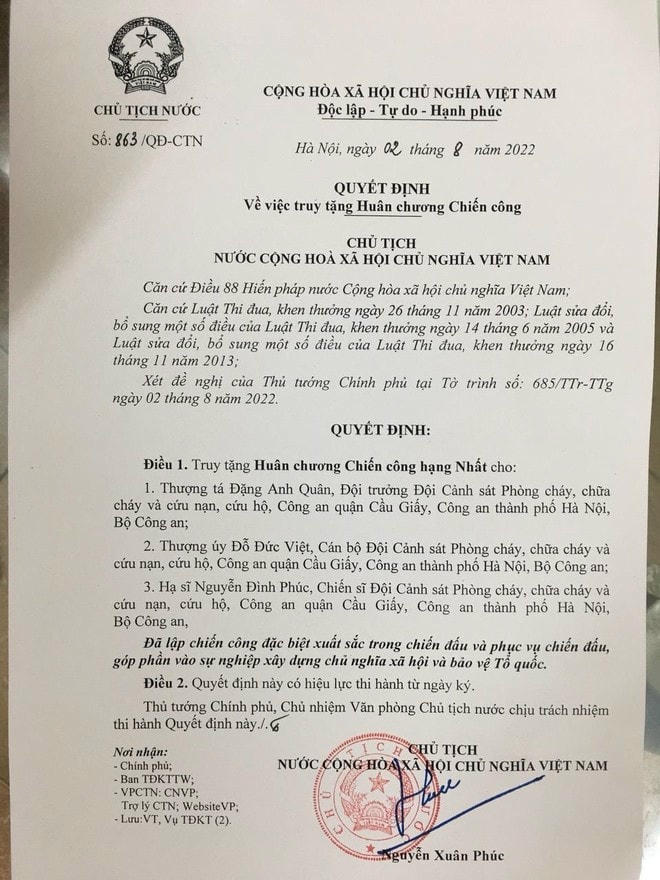 Ngày 2/8, Chủ tịch nước Nguyễn Xuân Phúc đã ký Quyết định về việc truy tặng Huân chương Chiến công cho 3 cán bộ, chiến sĩ Công an quận Cầu Giấy, Hà Nội hy sinh trong quá trình làm nhiệm vụ chữa cháy tại quán karaoke.