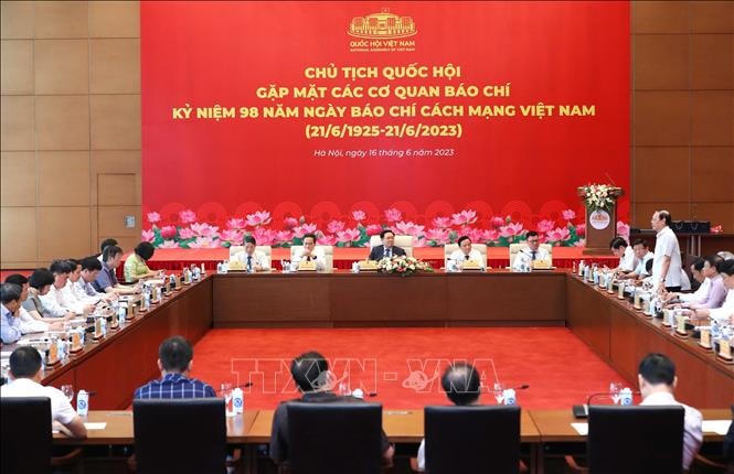 Chiều 16/6, tại Hà Nội, Chủ tịch Quốc hội Vương Đình Huệ cùng với các Phó Chủ tịch Quốc hội gặp mặt các cơ quan báo chí nhân Kỷ niệm 98 năm Ngày báo chí Cách mạng Việt Nam (21/6/1925 - 21/6/2023).