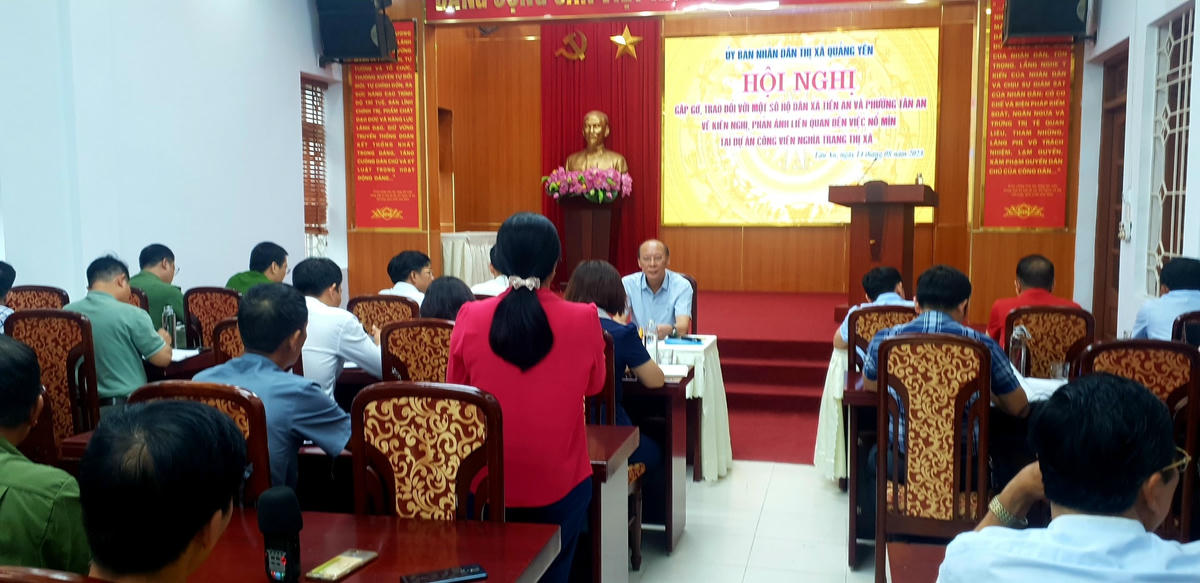 Trước yêu cầu chính đáng của người dân, sáng 14/8, UBND TX Quảng Yên đã tổ chức hội nghị gặp gỡ, trao đổi với các hộ dân về kiến nghị, phản ánh liên quan đến việc nổ mìn tại dự án công viên nghĩa trang thị xã. Chủ tịch UBND thị xã Trần Đức Thắng chủ trì, ngoài ra còn có sự giám sát của Chủ tịch MTTQ thị xã Quảng Yên, cùng các phòng, ban chuyên môn, chủ đầu tư và đơn vị thực hiện nổ mìn.