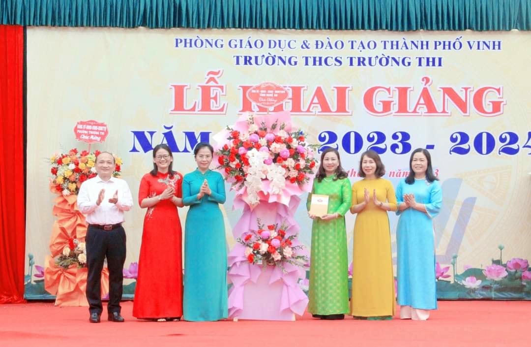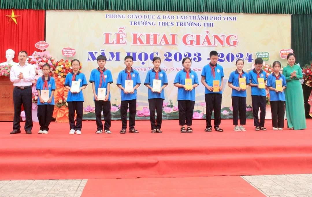 Đánh trống khai trường chào mừng năm học mới 2023 - 2024, Chủ tịch UBND tỉnh Nguyễn Đức Trung cũng đã trao bằng khen của UBND tỉnh Nghệ An cho các thầy cô Trường THPT chuyên Phan Bội Châu có thành tích xuất sắc trong đào tạo, bồi dưỡng học sinh đạt giải cao trong các kỳ thi quốc gia, quốc tế năm học vừa qua.