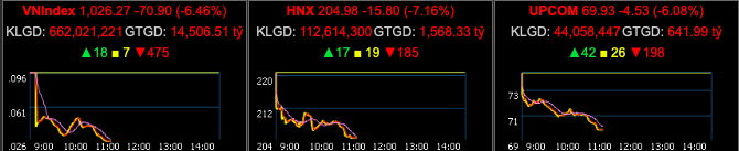 Tính đến 11h30 ngày 28/1, VN-Index đã giảm 1 mạch gần 70 điểm (tương đương với hơn 6,4%) về mốc 1.026,3 điểm. HNX-Index giảm 15 điểm (7,16%) xuống 205 điểm. UPCoM-Index giảm 4,53 điểm (-6,08%) xuống 69,93 điểm.