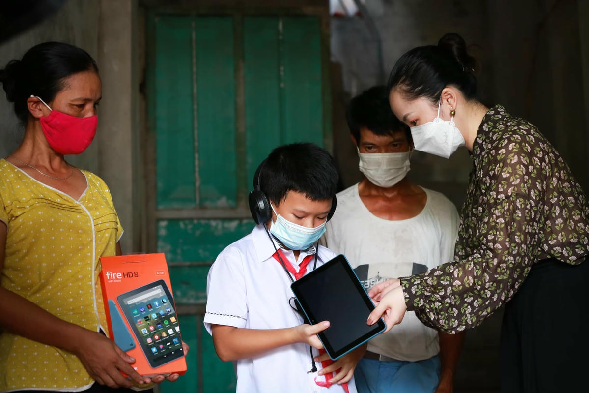 - 01 mạnh thường quân ở quận Đống Đa tặng 25 thiết bị học trực tuyến, gồm 18 máy tính bảng Kindle Fire HD8 và 7 điện thoại Samsung Galaxy M02