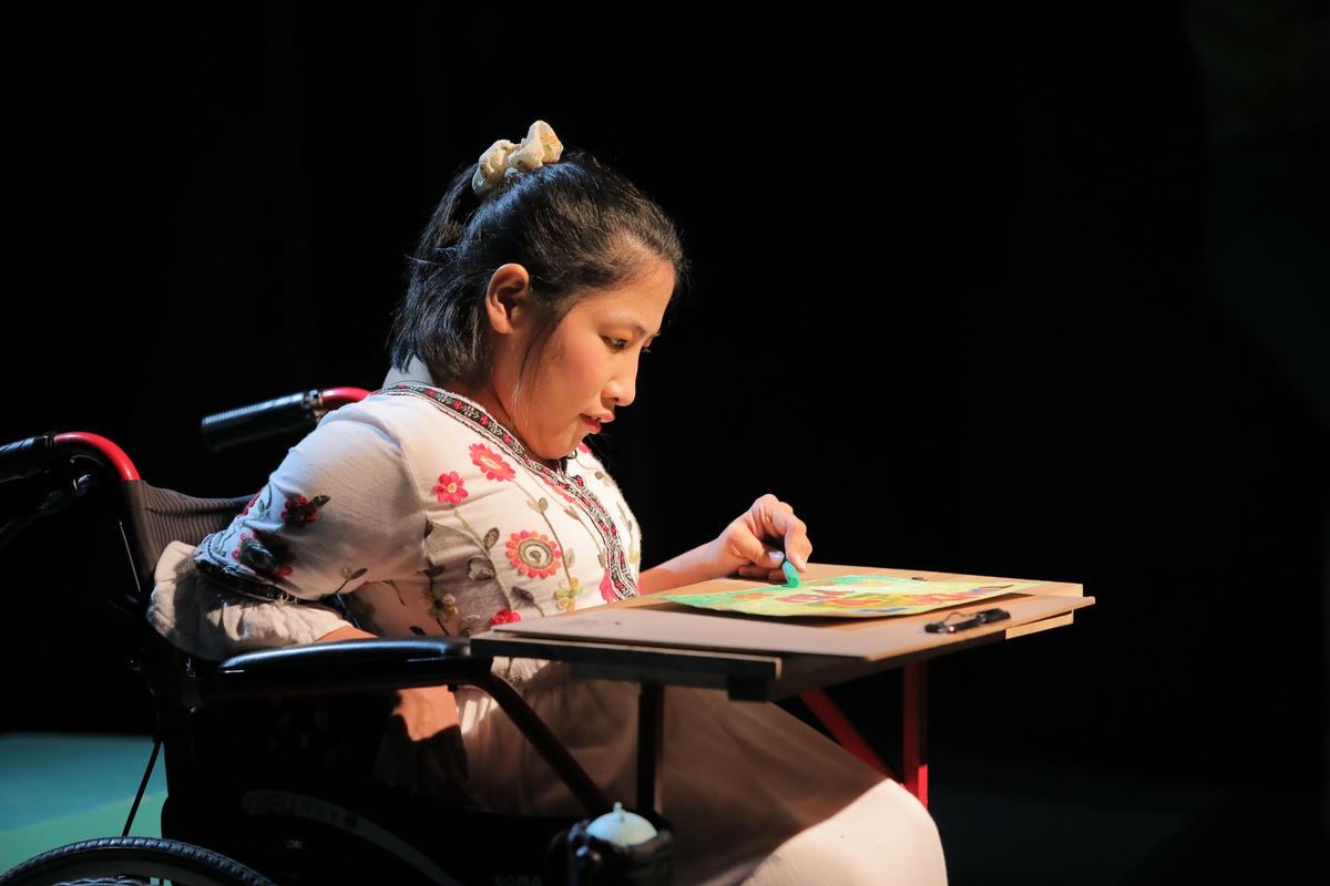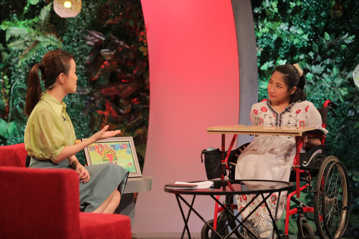 Mang đến "Trạm yêu thương" một bức tranh, Nguyễn Thùy Chi tự tin giới thiệu mình rất thích vẽ và bức tranh này mang màu xanh lá - màu của niềm vui, niềm hy vọng. Đó cũng chính là màu của cộng đồng những người mắc bệnh bại não giống như Chi.