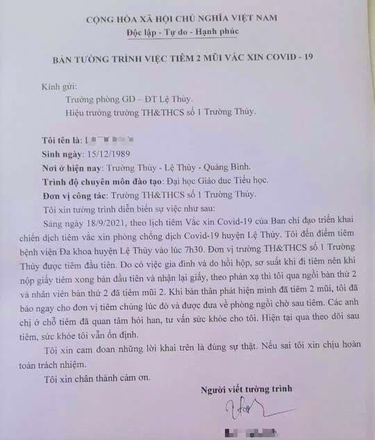 Ngày 20/9, phòng Giáo dục và Đào tạo huyện Lệ Thủy (tỉnh Quảng Bình) đã nhận được bản tường trình của cô L.T.L. (32 tuổi, giáo viên trường Tiểu học và THCS số 1 Trường Thủy) về việc tiêm 2 mũi vaccine phòng Covid-19 cách nhau 10 phút.