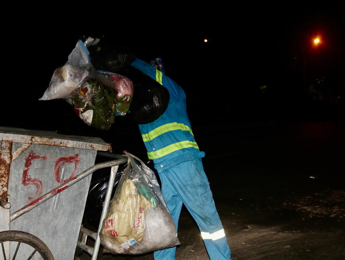 Trời mỗi lúc một tối, màn đêm phủ kín tại điểm tập kết rác nằm trên đường Phú đô (Mễ Trì, Nam Từ Liêm, Hà Nội), lúc này những công nhân vệ sinh môi trường vẫn đang miệt mài với công việc dọn rác. Tranh thủ xách những bao tải rác cho vào thùng, chị Nguyễn Thùy Lâm (39 tuổi, Phú Đô, Hà Nội) cho biết, ngày nào cũng như ngày nào, công việc của chị bắt đầu từ 16h và kết thúc vào lúc 24h, hôm nào nhiều việc có thể làm đến 1, 2h sáng.