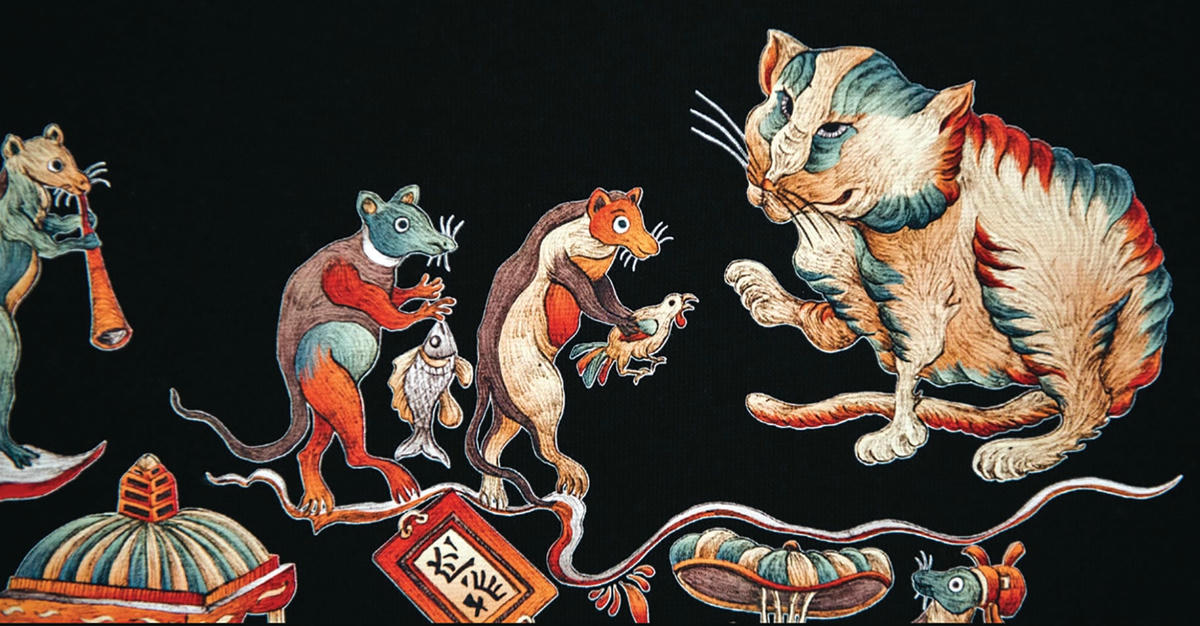 Có lẽ không người Việt Nam nào không biết đến bức trang dân gian Đông Hồ “Đám cưới chuột”. Con mèo ngồi ở góc tranh như một quyền lực, mà đám chuột dù có võng lọng xênh xang, kèn trống ỏm tỏi thì khôn hồn vẫn phải cống nạp.