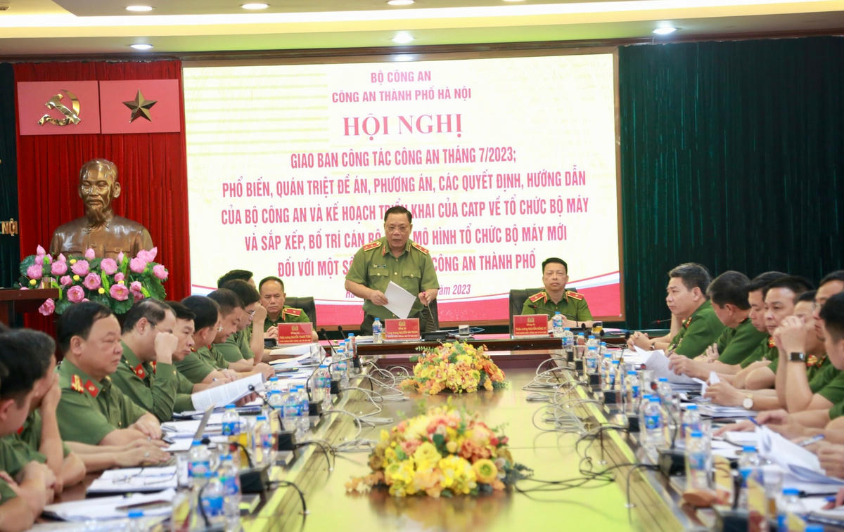 Ngày 28/7, Công an TP Hà Nội tổ chức hội nghị trực tuyến phổ biến, quán triệt Đề án số 19/ĐA-BCA, ngày 10/7/2023 của Bộ Công an và các Phương án, quyết định, hướng dẫn, Kế hoạch của Bộ Công an, Công an thành phố về kiện toàn tổ chức bộ máy và sắp xếp, bố trí cán bộ theo mô hình tổ chức bộ máy mới đối với một số đơn vị thuộc Công an thành phố.