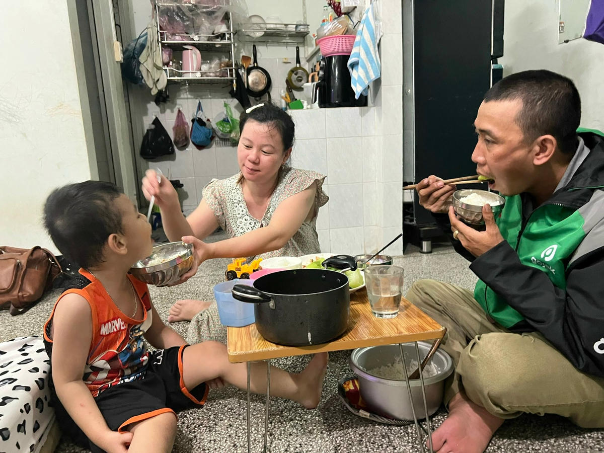 Chỉ vào bịch rau xanh và chục trứng vừa mua tại chợ cóc sau buổi tan ca chiều, chị Nguyễn Hoài Thương (quê ở Quảng Ngãi), công nhân khu Công nghệ cao TPHCM chia sẻ: “Bấy nhiêu là đủ ba chị em gái ở cùng phòng ăn trong 2 buổi tối”. Khi được hỏi về bữa sáng, chị Thương bảo, tối luộc sẵn ít khoai, sáng hôm sau lót dạ là xong bữa.