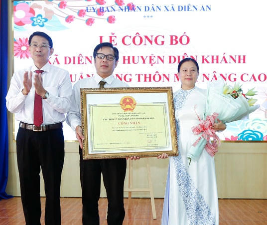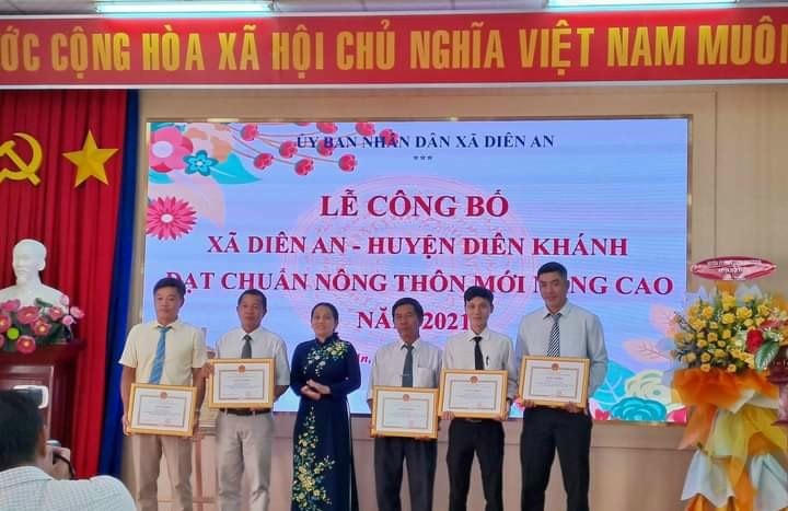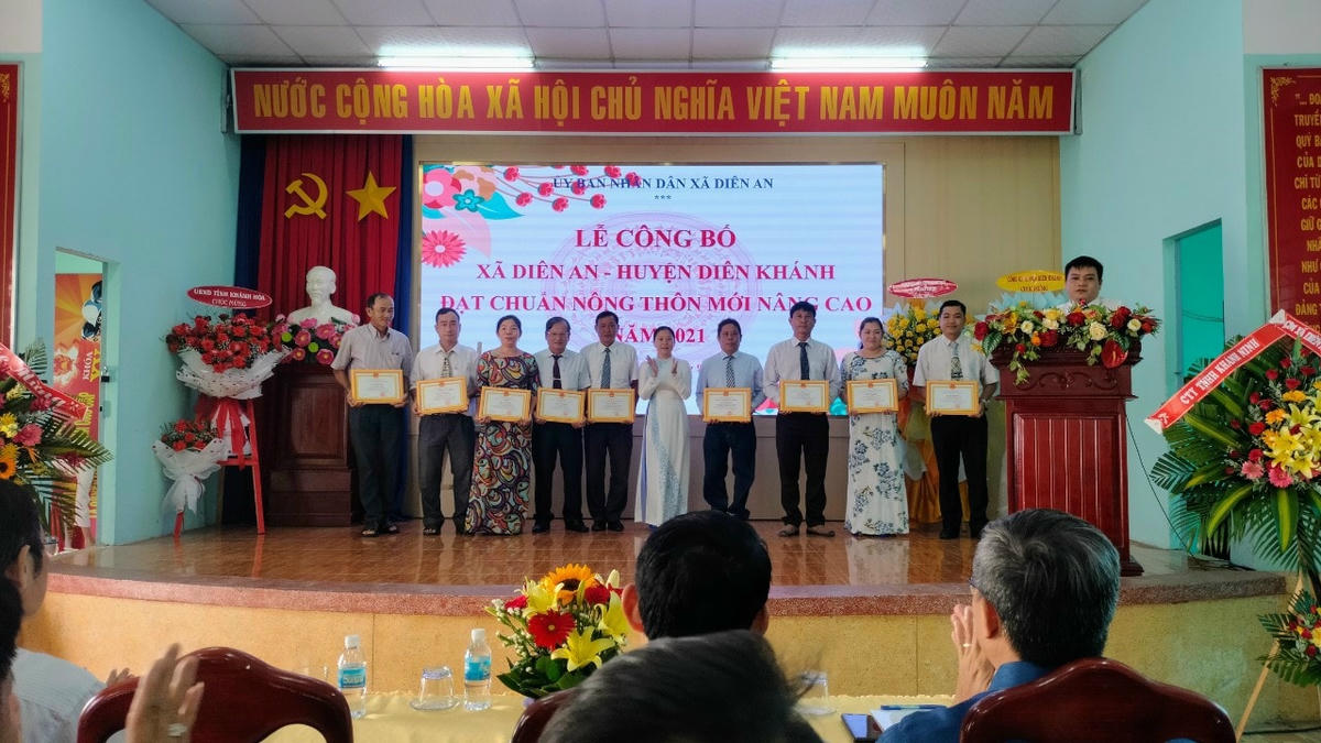 Nhân dịp này, UBND tỉnh Khánh Hòa trao bằng công nhận xã đạt chuẩn nông thôn mới nâng cao cho lãnh đạo nhân dân xã Diên An, UBND huyện Diên Khánh củng đã trao giấy khen cho 1 tập thể và 5 cá nhân; UBND xã Diên An tặng giấy khen cho 3 tập thể và 9 cá nhân đã có thành tích xuất sắc trong việc xây dựng xã đạt chuẩn NTM nâng cao trong thời gian qua.