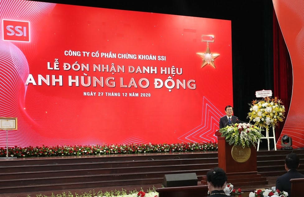 Tại buổi lễ, Phó Chủ tịch nước Đặng Thị Ngọc Thịnh đã trao Huy hiệu, Bằng Danh hiệu và Cờ Danh hiệu Anh hùng Lao động thời kỳ đổi mới cho lãnh đạo Công ty CP Chứng khoán SSI.