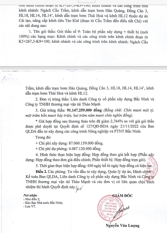 Tiếp đó, ngày 16/12/2022, ông Nguyễn Văn Lượng - Giám đốc Ban Quản lý dự án đầu tư xây dựng các công trình Nông nghiệp và PTNT Bắc Ninh tiếp tục ký ban hành quyết định số 156 phê duyệt liên danh Công ty cổ phần xây dựng Bắc Ninh- Công ty TNHH Thương mại vận tải Thảo Mạnh trúng thầu gói thầu số 9: Toàn bộ phần xây dựng + thiết bị các hạng mục: Kênh chính và các công trình trên kênh chính đoạn từ K5+267,3-K9+100; kênh nhánh và các công trình trên kênh nhánh: Ngách Cầu Trằm, kênh dẫn trạm bơm Hán Quảng, Đồng Cân 3, HL18, HL14, HL14’, kênh dẫn trạm bơm Thái Hòa và kênh HL12... với giá trúng thầu là 91 tỷ 147 triệu đồng.
