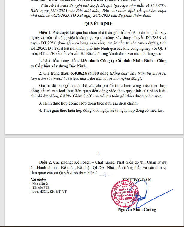 Cũng trong tháng 12/2022, Công ty cổ phần Xây dựng Bắc Ninh (liên danh) cũng được Giám đốc Ban Quản lý dự án xây dựng giao thông Bắc Ninh ký ban hành quyết định lựa chọn trúng thầu gói thầu số 8: Phần xây dựng và thiết bị (mới 100%) các hạng mục: Đường giao thông và cầu vượt QL.3 mới... với giá trúng thầu là 318 tỷ 368 triệu đồng.