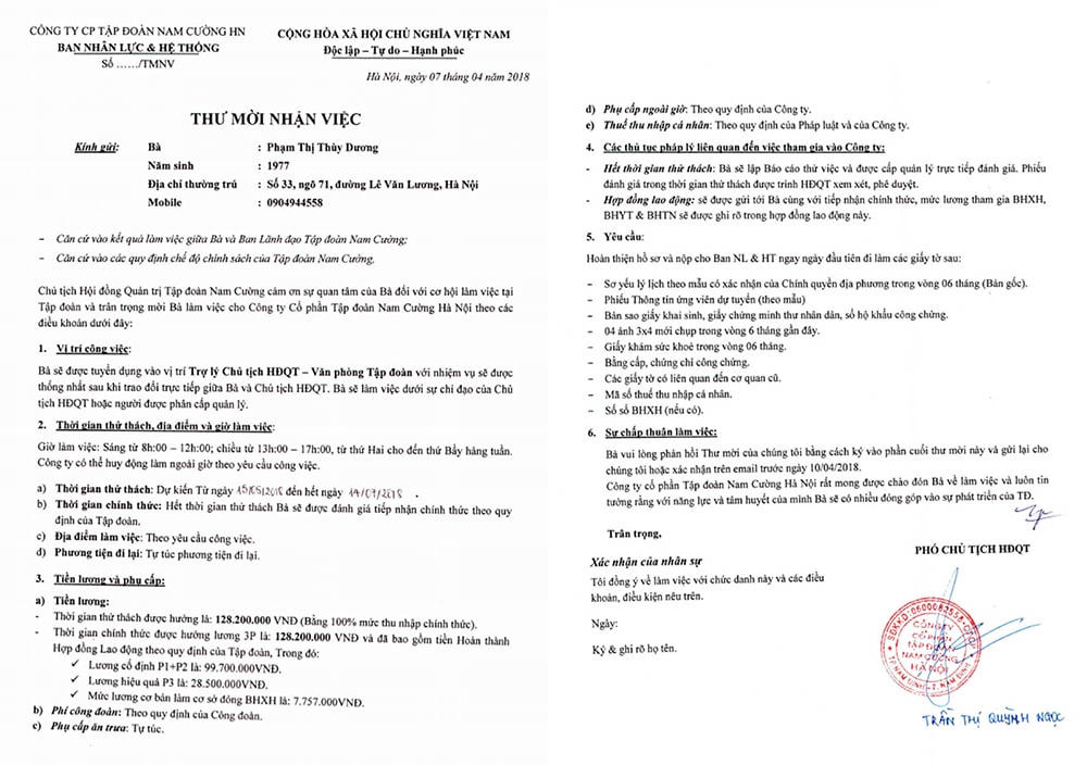 Ngoài ra, toàn bộ các khoản lương mà bà Dương nhận được hàng tháng là khớp với phiếu lương do Ban Nhân lực và Hệ thống của Công ty Nam Cường gửi. Tuy nhiên, trên thông tin tài khoản chuyển tiền không ghi rõ đơn vị chuyển là Công ty Nam Cường.