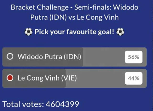 Sau vài ngày bình chọn, Công Vinh đã thất bại trước đối thủ người Indonesia. Theo đó, trong số 4,6 triệu phiếu bầu, ngôi sao của bóng đá Việt Nam chỉ nhận được 44%, còn Widodo Putra nhận được 56%.