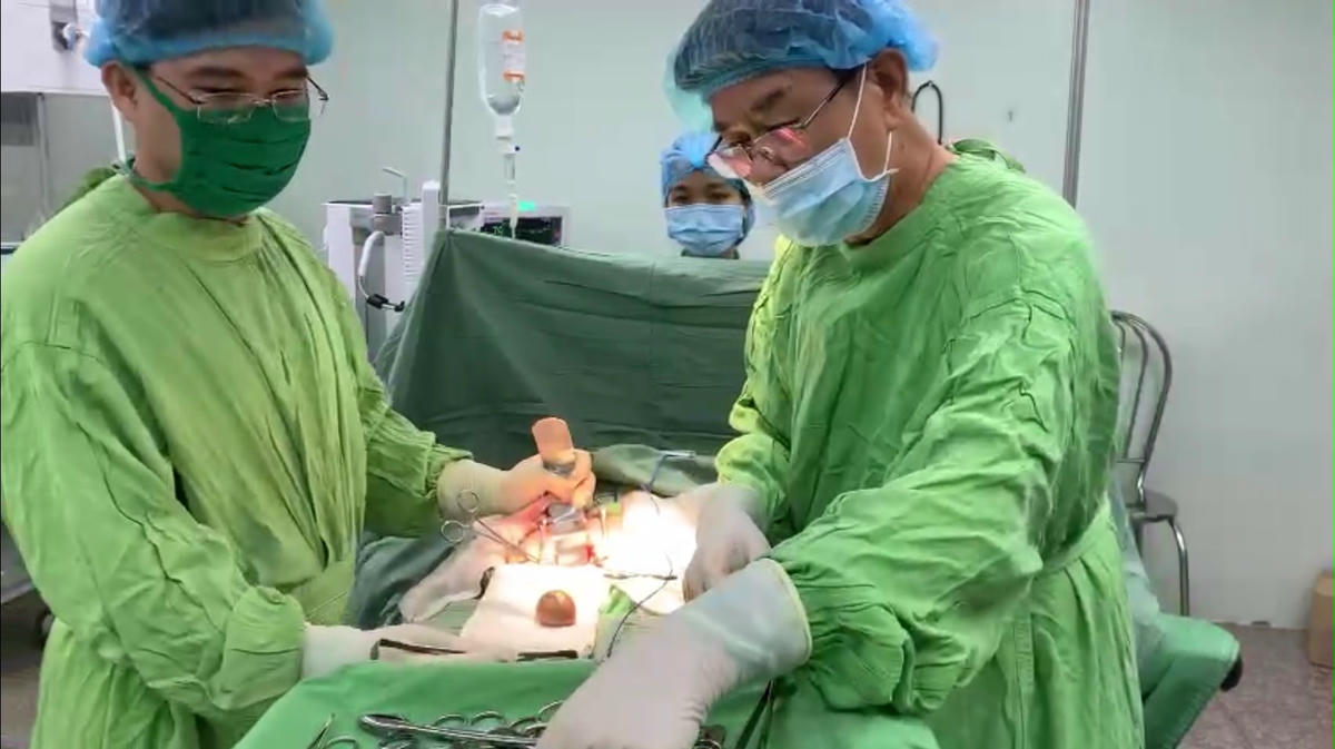 Ê kíp Bs.CK2 Nguyễn Phước Lộc, Trưởng khoa Ngoại Thận – Tiết niệu, Bs. Hoàng Duy Tân (khoa Ngoại Thận – Tiết niệu), Bs. Lý Thị Băng Thanh (khoa Phẫu thuật – Gây mê hồi sức) thực hiện phẫu thuật lấy thành công viên sỏi bàng quang kích thước 5x4x5 cm (to bằng quả trứng gà) có đầu sonde JJ nằm bên trong, thực hiện rút thành công sonde JJ. Thời gian phẩu thuật trong 60 phút.