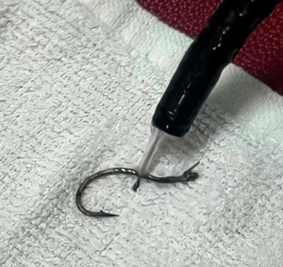 Ngay sau đó, ê-kíp nội soi đã gắp ra ngoài dị vật là một chiếc lưỡi câu có chiều dài khoảng 4cm, vòng cung rộng gần 1,5cm.
