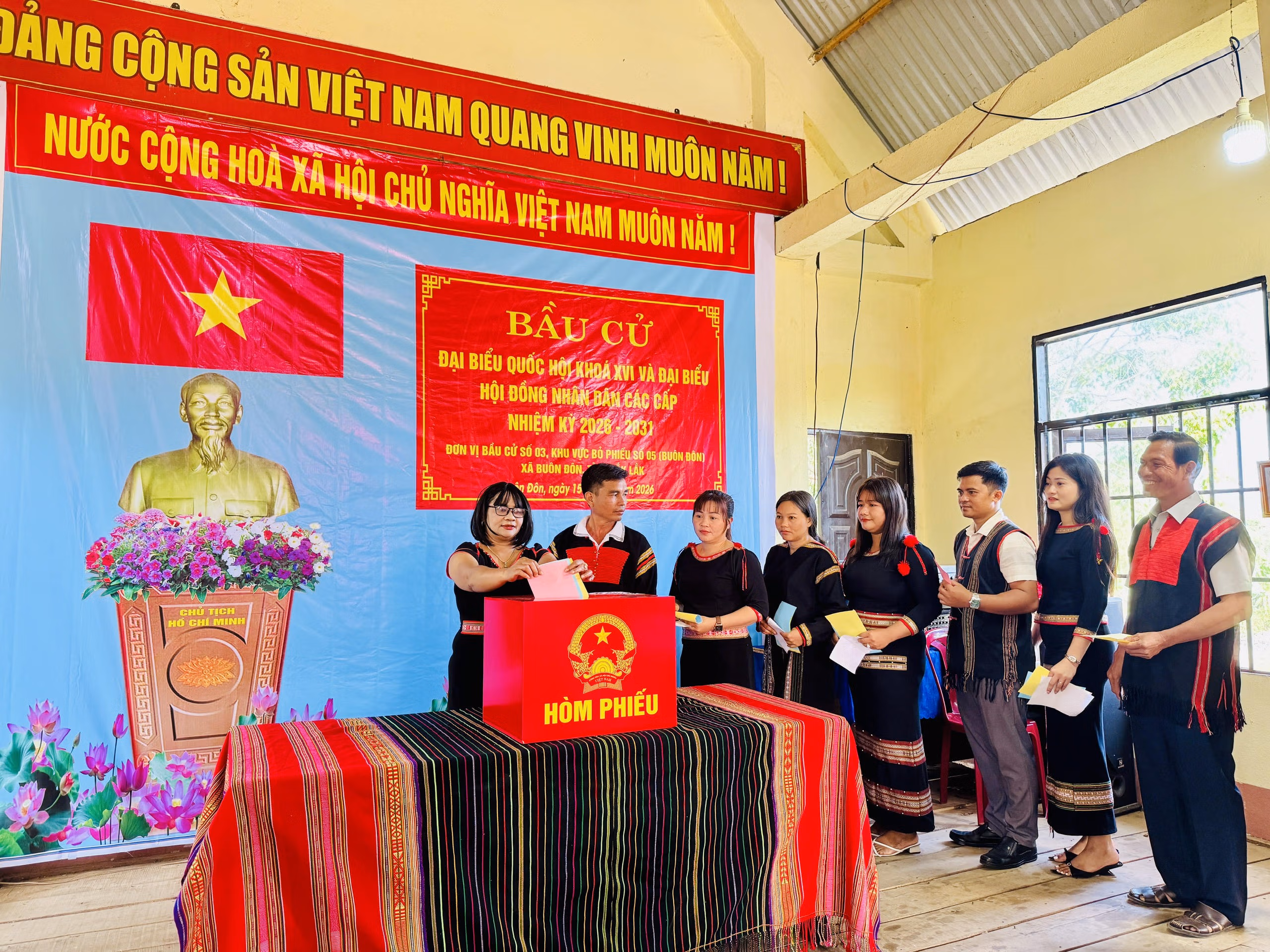 Sáng ngày bầu cử, khắp các buôn làng của xã Buôn Đôn rực rỡ sắc đỏ của cờ Tổ quốc. Những con đường đất đỏ dẫn vào các điểm bỏ phiếu được trang hoàng cờ hoa, băng rôn, khẩu hiệu. Từ sáng sớm, bà con đã nô nức đến các điểm bầu cử với trang phục truyền thống rực rỡ, gương mặt ai cũng ánh lên niềm vui và niềm tự hào.