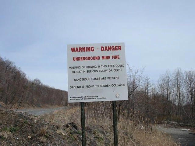 Centralia (bang Pennsylvania) nằm trên một số mỏ than đá lớn nhất thế giới. Những mỏ than đầu tiên tại đây được khai thác vào năm 1856 và từ đó, thị trấn Centralia ra đời, thu hút vô số người đến khai thác than. Sau một thời gian ngắn, thị trấn trở nên phồn vinh hơn với nền kinh tế chủ yếu dựa vào các doanh nghiệp sản xuất than. Khoảng hơn 1.000 người sinh sống tại nơi này ở thời điểm đó. Thế chiến I và khủng hoảng của thị trường chứng khoán năm 1929 khiến sản lượng khai thác than giảm xuống trong vài thập kỷ tiếp theo, tuy nhiên Centralia đã có thể vượt qua khủng hoảng ấy. Điều khiến Centralia suy thoái hoàn toàn đến mức bị bỏ hoang như ngày nay chính là kế hoạch thiếu tính toán trong việc dọn sạch bãi rác của thị trấn. Hàng năm, Centralia đều dọn dẹp và đốt rác trong thị trấn để chuẩn bị chào đón Ngày Tưởng Niệm. Tháng 5/1962, thị trấn cũng thực hiện việc đốt rác như thế, nhưng khu vực được dùng để đốt rác năm đó là một mỏ than cũ không còn sử dụng. Hành động tưởng chừng như vô hại ấy đã tuyên án tử cho cả thị trấn phồn vinh này. Bên dưới bãi rác khoảng 90m là một mỏ than chưa được khai thác, dài 13 km và trải rộng khoảng 15 km2. Ngọn lửa vẫn tiếp tục âm ỉ bên dưới lòng đất và từ từ lan rộng ra khắp cả mỏ than. Các đường hầm dẫn đến mỏ than trở thành nguồn cung cấp không khí "nuôi sống" ngọn lửa. Trong vòng vài tuần, ngọn lửa đã lan ra khắp các ngõ ngách trong hầm mỏ bên dưới thị trấn. Ước tính, nhiệt độ tại trung tâm mỏ than lên đến 540 độ C. Một số nơi mặt đất nóng bỏng, khí độc CO, sunfurơ… từ những kẽ đất đá nứt toác liên tục bốc lên giống như lửa địa ngục nằm ngay bên dưới lòng thị trấn, gần như làm cư dân ngạt thở. Ở nơi khác, mặt đất trông có vẻ bình thường, nhưng hiểm họa lại vô cùng khôn lường do than bị đốt cháy hết để lại một lỗ hổng khổng lồ ngay bên dưới. Một đứa bé 12 tuổi từng bị một cái hố nuốt chửng vào năm 1981 và đã may mắn sống sót. Chính quyền cố gắng dập tắt ngọn lửa trong vô vọng suốt nhiều năm. Họ đã chi khoảng 7 triệu USD khoan hố xuống hầm mỏ và lấp cát để chặn nguồn không khí, nhưng cách này không hiệu quả. Họ buộc phải dừng lại vào thập niên 1980. Theo ước tính, chính quyền đã dùng 42 triệu USD để mua nhà của những cư dân trong thị trấn này và tái định cư cho họ. Hiện Centralia là thị trấn ít người ở nhất Pennsylvania. Năm 2018, chỉ có 6 cư dân sinh sống tại đây. Bưu chính Mỹ đã vô hiệu hóa mã bưu chính của thị trấn này từ năm 2002. Năm 2013, một thỏa thuận được thiết lập để cho phép những người còn lại có thể tiếp tục sống trong thị trấn, với điều kiện họ không được bán hoặc cho người thân kế thừa tài sản của mình. Ngày nay, ngọn lửa ở Centralia bao phủ 15,5 km2 và lan rộng 23 m mỗi năm. Các nhà nghiên cứu dự đoán ngọn lửa có thể tiếp tục cháy trong 250 năm tới. Điều đáng ngạc nhiên là thị trấn này chỉ là một trong 38 hầm mỏ bị cháy cho đến ngày nay tại Pennsylvania.
