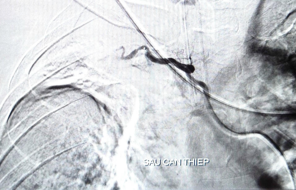 Bệnh viện đã thực hiện can thiệp nút tắc động mạch phế quản. Kết quả ghi nhận nhiều nhánh tăng sinh động mạch phế quản phổi (P) xuất phát từ động mạch ngực trong (P), thực hiện tắc mạch cầm máu thành công sau 45 phút.