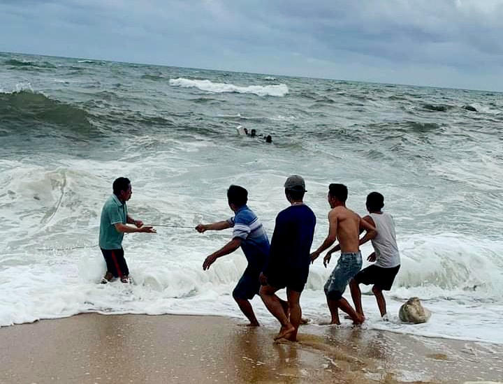 Khoảng 8h sáng, người dân thôn Lê Lợi và thôn Xuân Thắng (xã Kỳ Xuân) mới phát hiện và tổ chức cứu nạn đưa 3 ngư dân vào bờ an toàn.