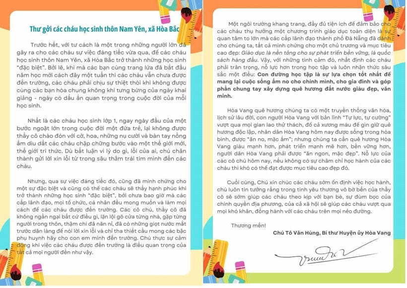 Ngày 12/9, ông Tô Văn Hùng, Bí thư huyện ủy huyện Hòa Vang đã gửi thư xin lỗi 54 học sinh tiểu học ở thôn Nam Yên không được đến trường và trở thành những học sinh “đặc biệt” vì lỗi của người lớn, trong đó có vai trò của cá nhân ông.
