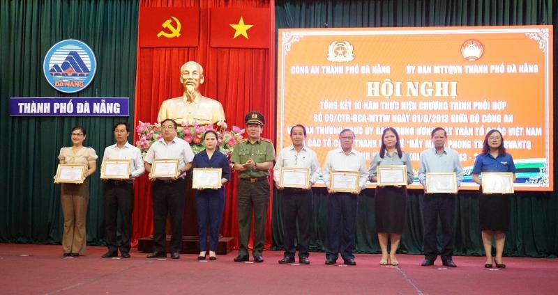 Tại hội nghị, UBND TP Đà Nẵng đã trao tặng Bằng khen cho 10 tập thể; Ủy ban MTTQ Việt Nam TP tặng Bằng khen cho 4 tập thể, 6 cá nhân; Giám đốc Công an TP tặng Giấy khen cho 7 tập thể, 2 cá nhân có thành tích xuất sắc trong thực hiện chương trình phối hợp (số 09/CTr-BCA-MTTW).