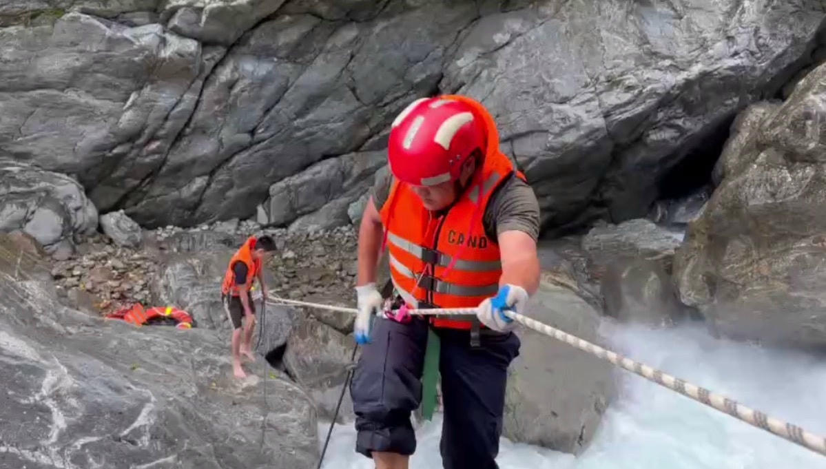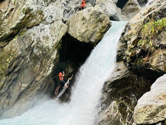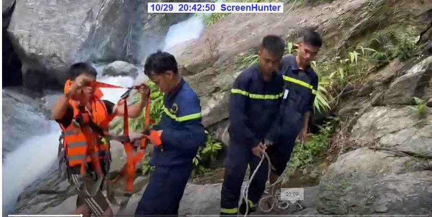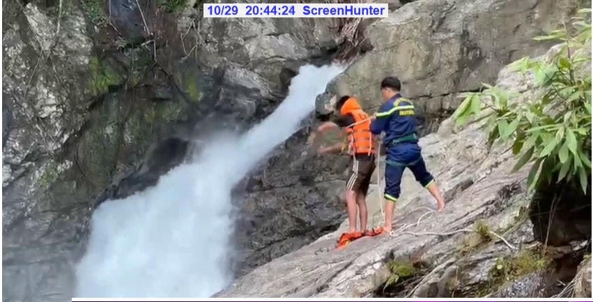 Du khách quốc tịch Nga được lực lượng cứu hộ đu dây, giải cứu khỏi thác nước cao trên dòng suối Khe Răm ở xã Hòa Bắc, huyện Hòa Vang (Đà Nẵng).
