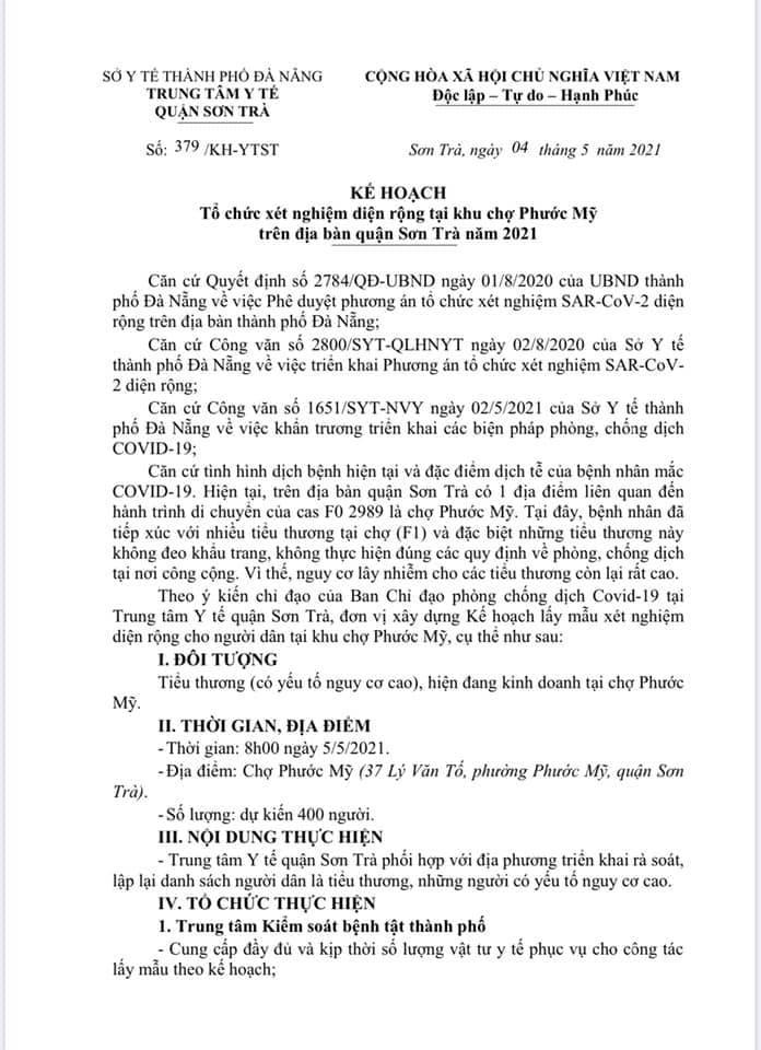 Tối 4/5, UBND quận Sơn Trà (Đà Nẵng) gửi công văn đến ban, ngành của quận này, chỉ đạo tạm dừng kinh doanh chợ Phước Mỹ, tổ chức xét nghiệm cho khoảng 400 tiểu thương do liên quan đến ca bệnh 2989.