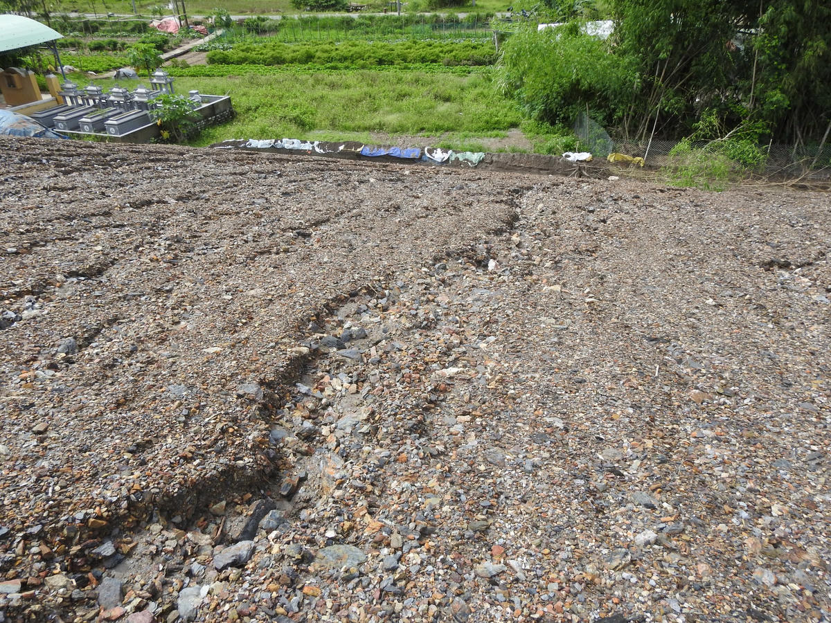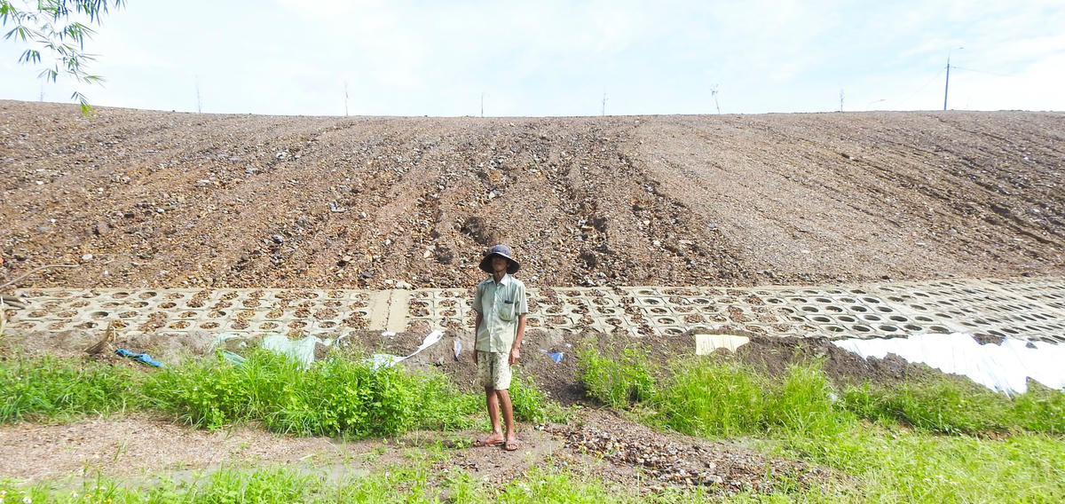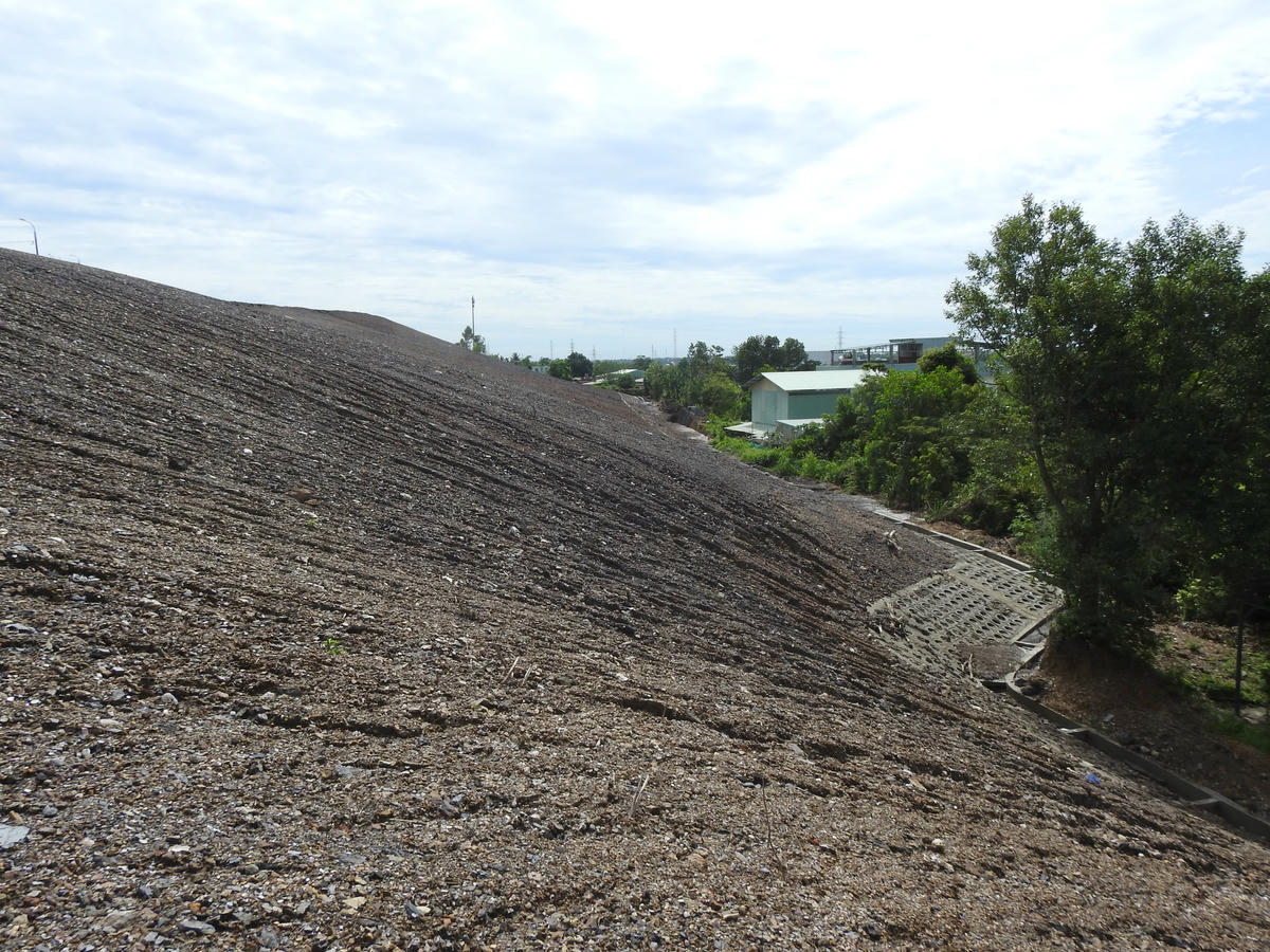 Vật liệu san lấp mặt bằng là đất đen, lổn nhổn đá, không kết dính nên chỉ trận mưa nhỏ là tràn xuống nhà cửa và ruộng vườn. Hàng cây được trồng ở mép taluy cũng lưa thưa, cây nọ cách cây kia khoảng 10 m.