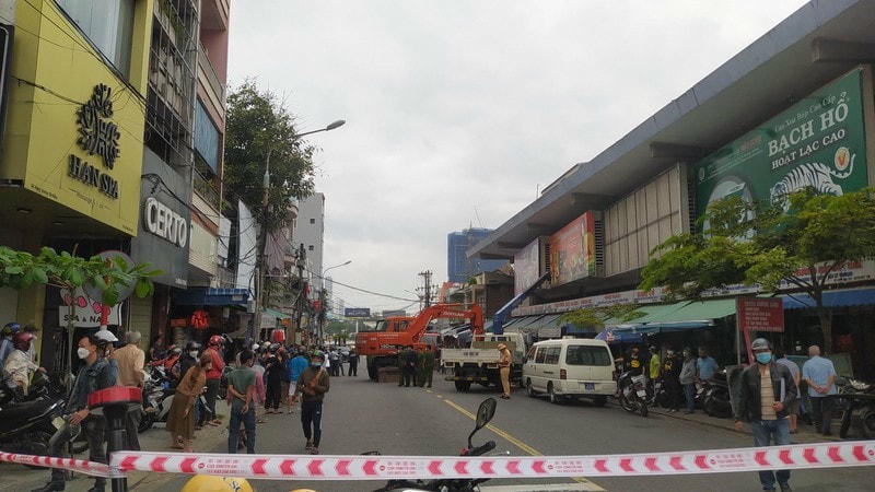 Cuối chiều 4/5, cơ quan chức năng quận Hải Châu vẫn phong tỏa hiện trường cống thoát nước trước ky ốt số 24 chợ Hàn trên đường Hùng Vương (đoạn giữa ngã tư Hùng Vương - Trần Phú và ngã ba Hùng Vương - Bạch Đằng - nơi phát hiện cánh tay và thi thể người.