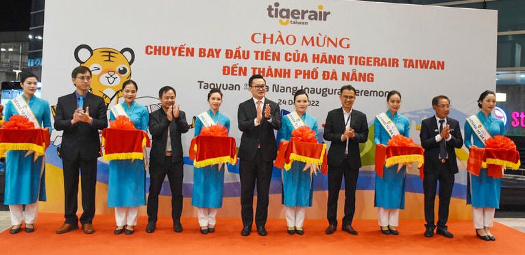 Trước đó, vào lúc 18h40 cùng ngày, 107 khách đầu tiên trên chuyến bay của của hãng Hàng không Tigerair Taiwan đã được chào đón nồng nhiệt tại ga đến quốc tế (Cảng hàng không quốc tế Đà Nẵng).