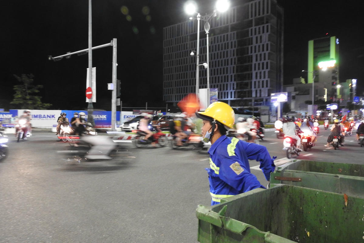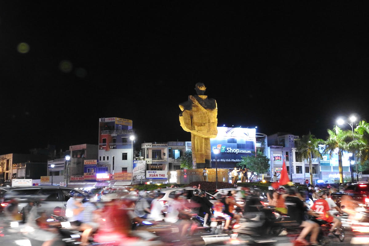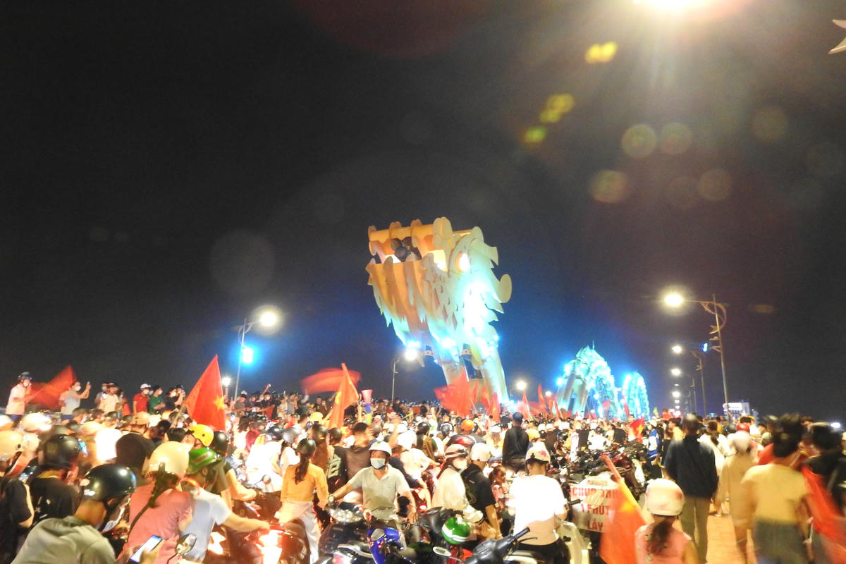 Các cây xăng ở cửa ngõ nghẹt cứng người đổ xăng để “đi bão” suốt đêm trên các tuyến đường trung tâm và các cây cầu bắc qua sông Hàn. Mọi tuyến đường và hai bên bờ sông Hàn của Đà Nẵng rực đỏ màu cờ trong men say chiến thắng, an toàn và trật tự