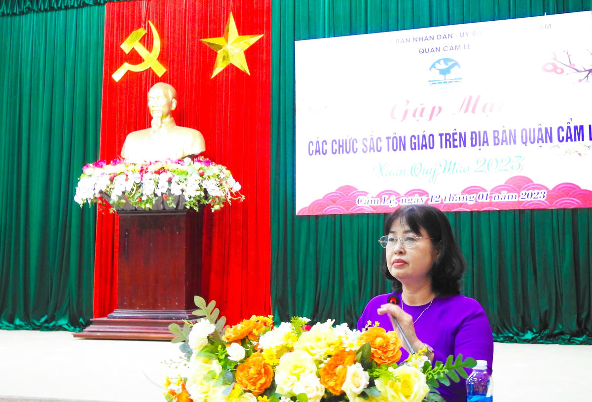 Phát biểu tại buổi gặp mặt, Chủ tịch Ủy ban MTTQ Việt Nam quận Cẩm Lệ, Phạm Thị Nhàn thông tin đến các chức sắc tôn giáo một số nét nổi bật về kinh tế và an sinh xã hội của năm 2022.