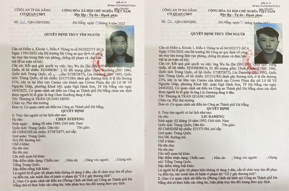 Chen Xuefeng và Liu Dameng bị Công an TP Đà Nẵng ra quyết định truy tìm do tấn công gây thương tích cho 1 đồng hương.
