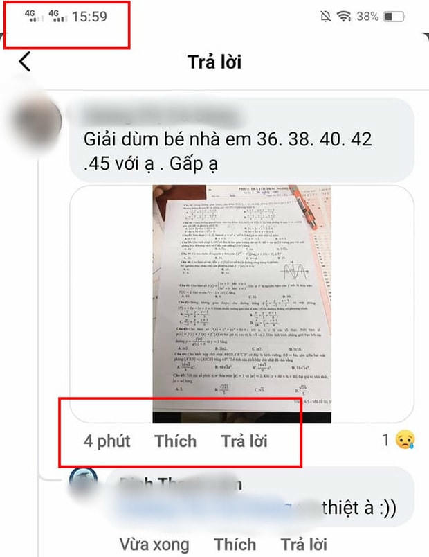 Vào khoảng 15h50 (vẫn trong thời gian thí sinh làm bài thi), người này bình luận một hình ảnh được cho là đề thi môn Toán: "Giải giùm bé nhà em câu 36, 38, 40, 41 với ạ. Gấp ạ". Đáng nói là hình ảnh được chụp vẫn được đặt trên bàn phòng thi và còn nguyên số báo danh lẫn phiếu trả lời trắc nghiệm của thí sinh đó.