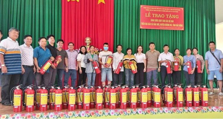 Phòng Cảnh sát phòng cháy chữa cháy và cứu nạn cứu hộ Công an tỉnh Đắk Nông phối hợp với một số doanh nghiệp kinh doanh dịch vụ phòng cháy tại TP Hồ Chí Minh trao tặng 50 bình chữa cháy cho các hộ dân ở xã Đắk DRô, huyện Krông Nô; trao tặng sách vở, bút, cặp, đồ dùng học tập và 60 phần quà bằng tiền mặt mỗi phần 500 ngàn đồng, cùng với 50 bình chữa cháy cho các hộ khó khăn trên địa bàn xã Đắk R’Moan, TP Gia Nghĩa với tổng trị giá hơn 150 triệu đồng.