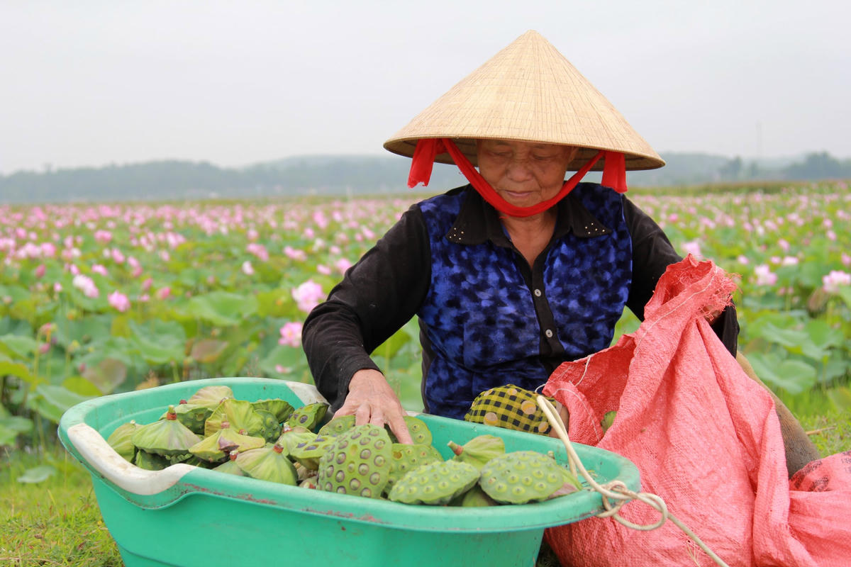 Bà Lê Thị Loan (trú thôn Thanh Châu) nhặt những đài sen vừa hái vừa chia sẻ, năm nay thời tiết thuận lợi nên sen của các gia đình thôn Thanh Châu rất nhiều hoa, đài sen lớn, hạt to, ăn có vị ngọt và bùi. Vì vậy được rất nhiều thương lái ưa chuộng, đến tận nhà thu mua và bán được giá.