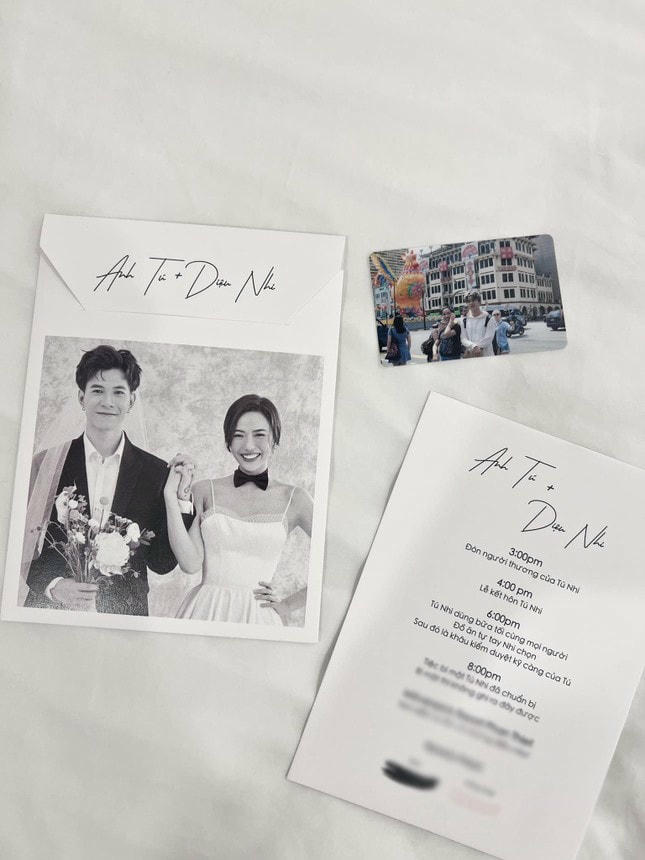 Theo thông tin từ thiệp cưới, đám cưới Diệu Nhi - Anh Tú sẽ được tổ chức vào ngày 10/10 tại quê nhà cô dâu ở Phan Thiết. Trên tấm thiệp cưới, Diệu Nhi - Anh Tú đan chặt tay nhau, cả hai nở nụ cười rạng rỡ. Trong khi Anh Tú điển trai nhưng lại đội khăn voan trắng của cô dâu thì Diệu Nhi lém lỉnh đeo nơ vốn dành cho chú rể.