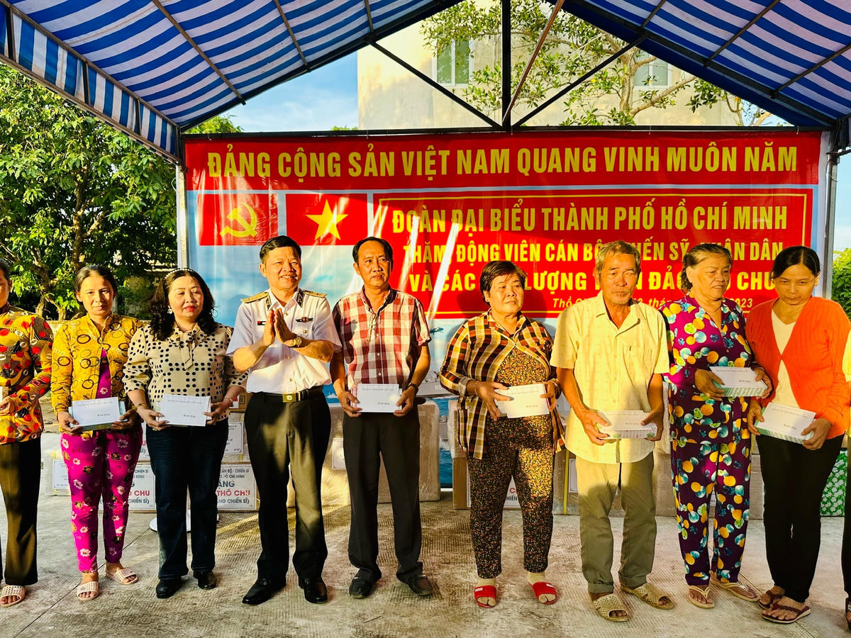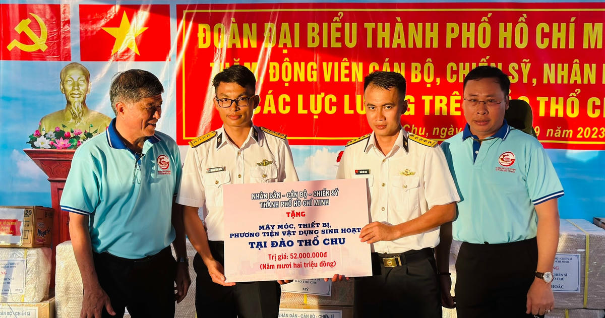 Đại diện đoàn công tác, ông Nguyễn Văn Hiếu, Giám đốc Sở GD&ĐT TP HCM cho biết, đoàn công tác vui mừng, xúc động được đến thăm cán bộ, chiến sĩ nhân dân trên đảo tiền tiêu phía Tây Nam của Tổ quốc. Mỗi hòn đảo ở Tây Nam đều có vị trí khác nhau và lợi thế quan trọng khác nhau, nhưng đều góp phần tạo nên thế trận vững chắc vùng biển Tây Nam của Tổ quốc. Nhưng điều khác biệt của đảo Thổ Chu so với những điểm đảo khác, đó là hòn đảo có đông dân cư sinh sống, chủ yếu bằng nghề nuôi trồng, khai thác và chế biến thủy sản. Mỗi người dân trên đảo Thổ Chu cũng chính là những chiến sĩ tham gia cùng các lực lượng trên đảo làm nhiệm vụ canh giữ biển trời của Tổ quốc…