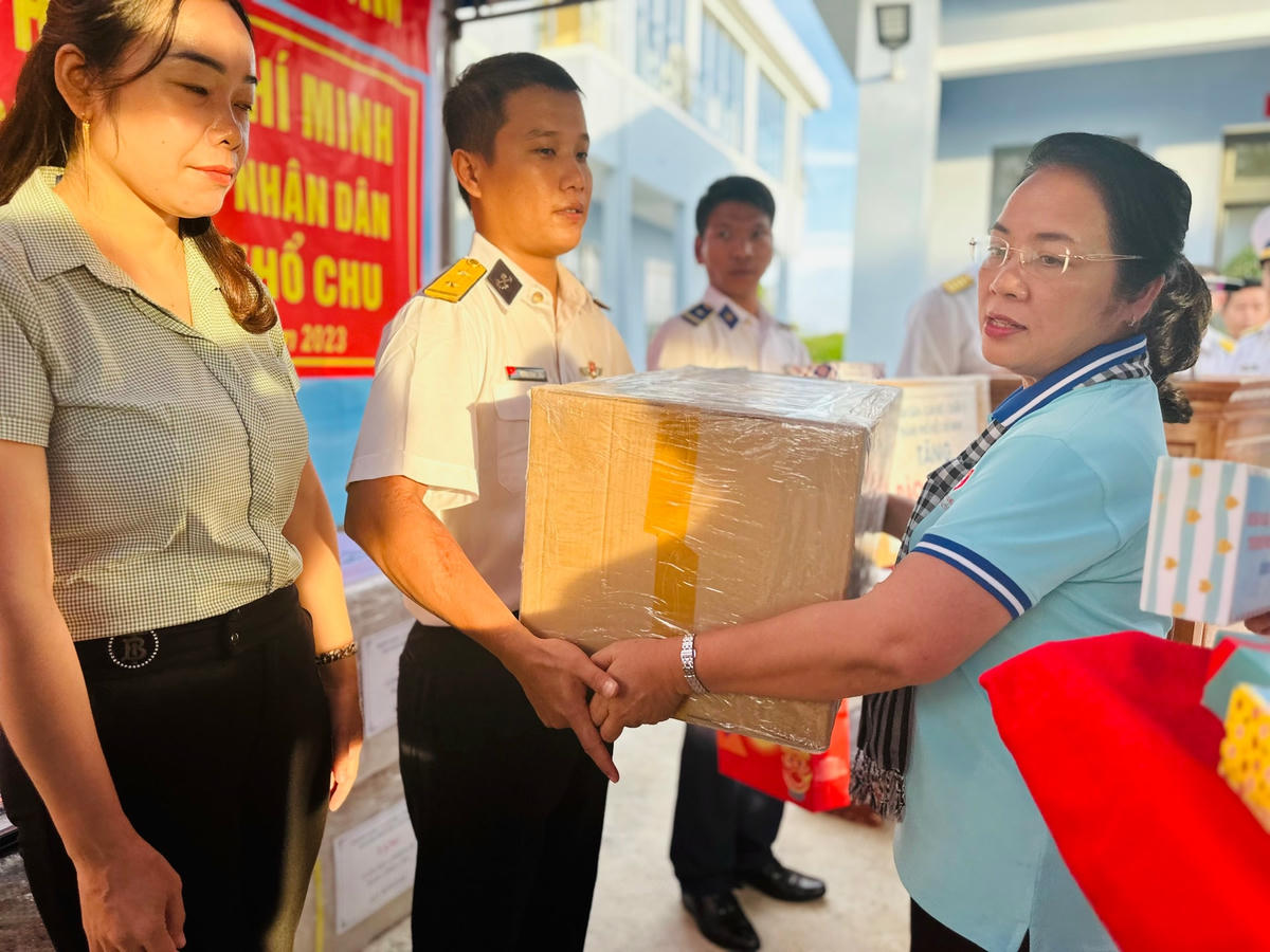 Tiếp đó, đoàn công tác đến thăm, tặng quà cán bộ chiến sĩ và các lực lượng trên đảo Thổ Chu: Trạm Rađa 610, Đảng ủy, UBND xã Thổ Châu, Trung đoàn 152, Đồn biên phòng 770, Trạm Hải đăng, Trạm SCB4, Lữ đoàn Công binh 25/QK9, Tiểu đoàn 887/Lữ đoàn 83, Trường Mầm non, Trường Tiểu học và THCS xã Thổ Châu. Tại các điểm thăm, các thành viên trong đoàn đã ân cần hỏi thăm, động viên cán bộ, chiến sĩ và người dân.