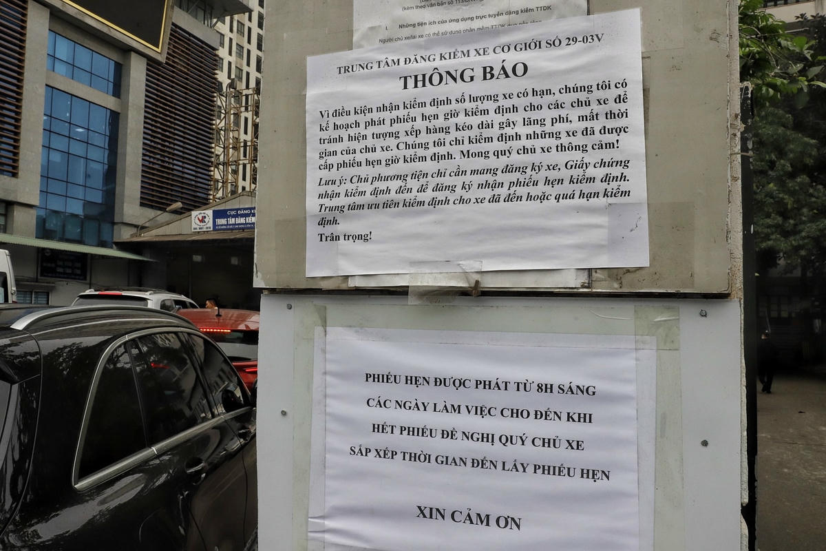 Theo ghi nhận của PV Báo Đại Đoàn Kết tại Trung tâm đăng kiểm 29-03S nằm trên đường Lê Quang Đạo, quận Nam Từ Liêm, Hà Nội) không còn tình trạng ô tô xếp hàng dài hàng trăm mét phía ngoài cổng trung tâm. Mà thay vào đó, các chủ phương tiện ô tô chỉ cần đến trung tâm để lấy giấy hẹn.Nhờ vậy, tình trạng các tài xế phải ăn chực nằm chờ đăng kiểm đã hạ nhiệt.Phía bên trong sân trung tâm đăng kiểm 29-03S các xe được xếp gọn gàng không còn cảnh lộn xộn chen chúc.Anh Nguyễn Anh Tuấn trú tại Thanh Xuân, Hà Nội chia sẻ, cách đây khoảng 20 ngày anh có đến trung tâm để đăng ký nhận lịch hẹn đăng kiểm. Nhờ vậy, việc đăng kiểm của anh cũng dễ dàng không cần phải chờ đợi quá nhiều thời gian mà chỉ cần đến hẹn là đến trung tâm đăng kiểm."Tôi cũng rất lo lắng khi trong tháng 4 xe tôi sẽ hết hạn. Nên đã chủ động đến trung tâm đăng kiểm 29-03S để đăng ký lịch đăng kiểm. Mặt khác, nhìn nhiều tài xế ăn chực nằm chờ mới có thể đăng kiểm khiến tôi cũng rất lo lắng bởi công việc của tôi khá bận bịu. Tuy nhiên, sau khi Nhà nước áp dụng nhiều quy định việc đăng kiểm cũng đã hạ nhiệt", anh Tuấn cho hay.Các phương tiện được đăng kiểm viên kiểm tra kỹ càng.Mỗi ngày, trung tâm đăng kiểm 29-03S có thể hoàn thành kiểm định cho 80-90 xe ô tô.Một chiến sĩ CSGT hỗ trọ trung tâm đăng kiểm 29-03S cho biết, sau thời gian tập huấn, anh em giờ đã quen việc nên làm rất nhanh.Tương tự, tại trung tâm đăng kiểm 29-03V (số 3 đường Cầu Giấy, phường Láng Thượng, quận Đống Đa, Hà Nội) có lượng phương tiện đông đúc hơn trung tâm 29-03S.Tại đây có 2 dây chuyền hoạt động, mỗi ngày có thể đăng kiểm được 170 ô tô.Các xe đều đã có giấy hẹn, đưuọc xếp số nên việc đăng kiểm diễn ra thuận lợi nhanh chóng.Để các tài xế ô tô không phải chờ đợi, trước cửa trung tâm này đã dán tờ thông báo hướng dẫn tài xế nhận số thứ tự và lịch hẹn nên các tài xế có thể dễ dàng chủ động. Nhờ vậy, tình trạng ùn tắc đăng kiểm giảm mạnh.