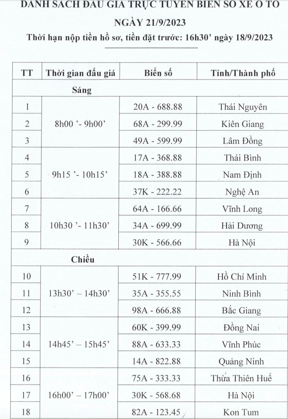 Cụ thể, trong buổi sáng 21/9, công ty dự kiến sẽ đưa ra đấu giá 9 biển số gồm: 20A-688.88, 68A-299.99, 49A-599.99 (khung giờ 8h-9h); 17A-368.88,18A-388.88, 37K-222.22 (khung giờ 9h15-10h15); 64A-166.66, 34A-699.99, 30K-566.66 (khung giờ 10h30-11h30).