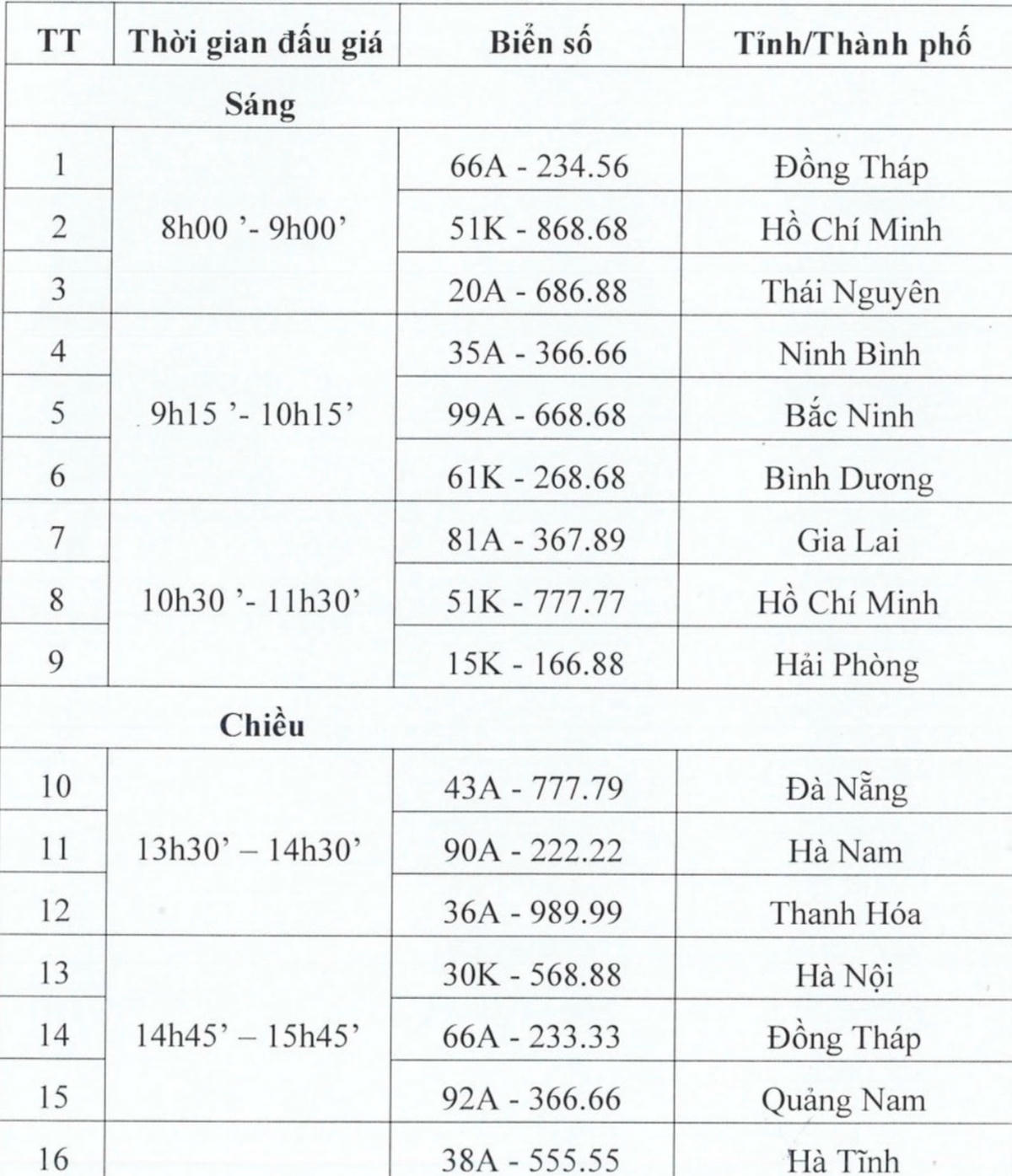 Buổi chiều 21/9, 9 biển số được đưa ra đấu giá gồm: 51K-777.99, 35A-355.55, 98A-666.88 (khung giờ từ 13h30 đến 14h30); 60K-399.99, 88A-633.33, 14A-822.88 (khung giờ từ 14h45 đến 15h45); 75A-333.33, 30K-568.68, 82A-123.45 (khung giờ từ 16h đến 17h).
