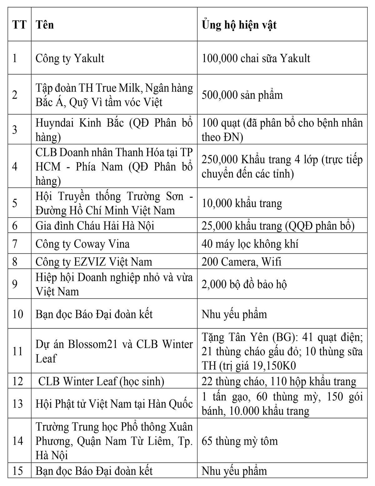 Danh sách các đơn vị, tổ chức và cá nhân đăng ký ủng hộ bằng hiện vật trong đợt quyên góp ủng hộ phòng, chống dịch bệnh Covid - 19 tại Mặt trận Trung ương (Từ ngày 01/5 đến ngày 24/6/2021)