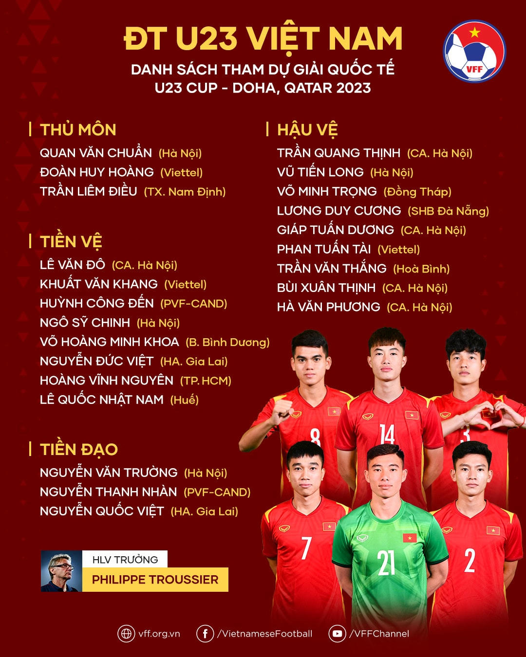 Theo tin từ Liên đoàn bóng đá Việt Nam, chiều 16/3, HLV trưởng Philippe Troussier đã đưa ra quyết định về danh sách chính thức 23 cầu thủ ĐT U23 Việt Nam tham dự giải bóng đá quốc tế U23 Cup - Doha, Qatar 2023.